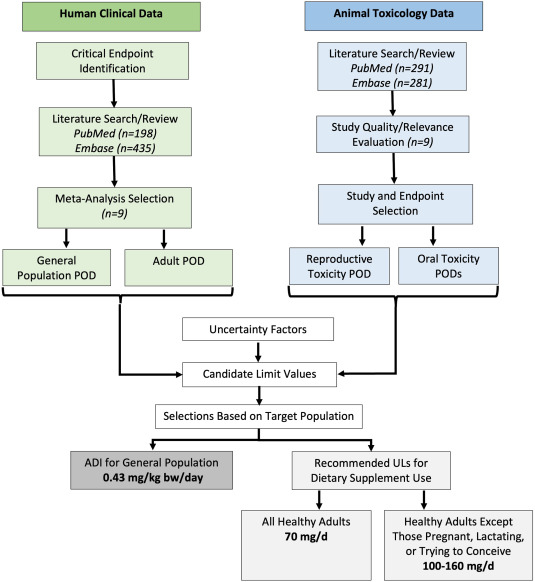 Enfin, Chaque POD est divisé par des facteurs d’incertitude appropriés pour en faire des valeurs limites d’apport candidates pour différentes populations cible tel que les adultes en bonne santé et les la population en général.